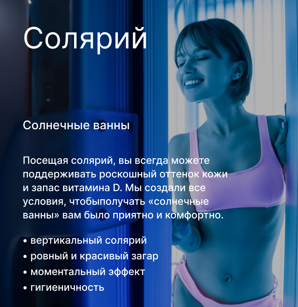 Посещая солярий, вы всегда можете поддерживать роскошныйоттенок кожи и запас витамина D. Мы создали все условия, чтобыполучать «солнечные ванны» вам было приятно и комфортно.